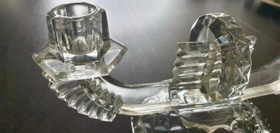 Decoratieve persglazen art deco kandelaar voor 2 kaarsen, modernistische vormgeving met symmetrische ornamenten. Het ontwerp is van Feigl & Morawetz, geproduceerd bij Libochovice in Bohemen. Onder de voet gemerkt: Tchecoslovakia. Afmetingen: Lengte 26cm, diameter voet 13cm, hoogte 13cm. Zware kwaliteit: gewicht 1194 gram. De kandelaar is in uitstekende staat.