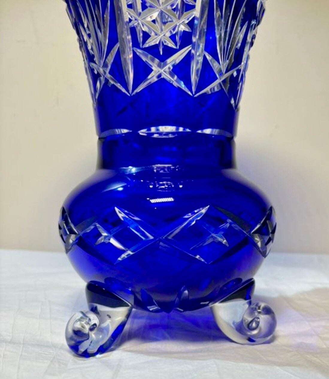 Blauwe zwaar kristallen grote vaas met gecompliceerd slijpsel.