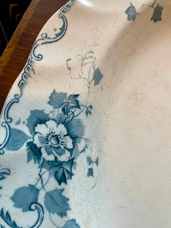 Deze antieke spectaculaire en zeldzame schaal met mooi ijs-craquelé is maar liefst 44 cm in doorsnede. Mooi om op een gedekte tafel te presenteren.